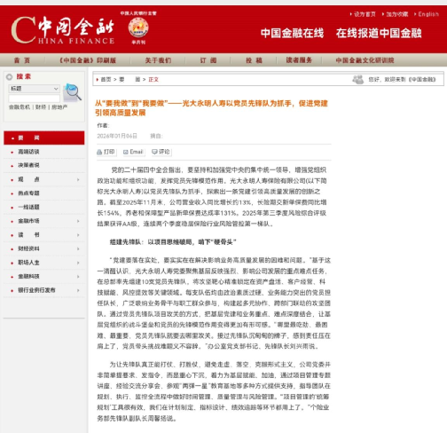 《中國金融》1月6日在其官網(wǎng)上發(fā)布文章《從“要我做”到“我要做”——光大永明人壽以黨員先鋒隊(duì)為抓手,促進(jìn)黨建引領(lǐng)高質(zhì)量發(fā)展》指出,光大永明人壽通過組建黨員先鋒隊(duì),推動(dòng)黨建與業(yè)務(wù)深度融合,聚焦資產(chǎn)盤活、客戶經(jīng)營等重點(diǎn)難點(diǎn),以項(xiàng)目管理賦能團(tuán)隊(duì),有效激發(fā)基層內(nèi)生動(dòng)力,實(shí)現(xiàn)了從“要我做”向“我要做”的轉(zhuǎn)變,帶動(dòng)營收與保費(fèi)快速增長,風(fēng)控評級(jí)持續(xù)領(lǐng)先,彰顯了黨建引領(lǐng)高質(zhì)量發(fā)展的實(shí)際成效。