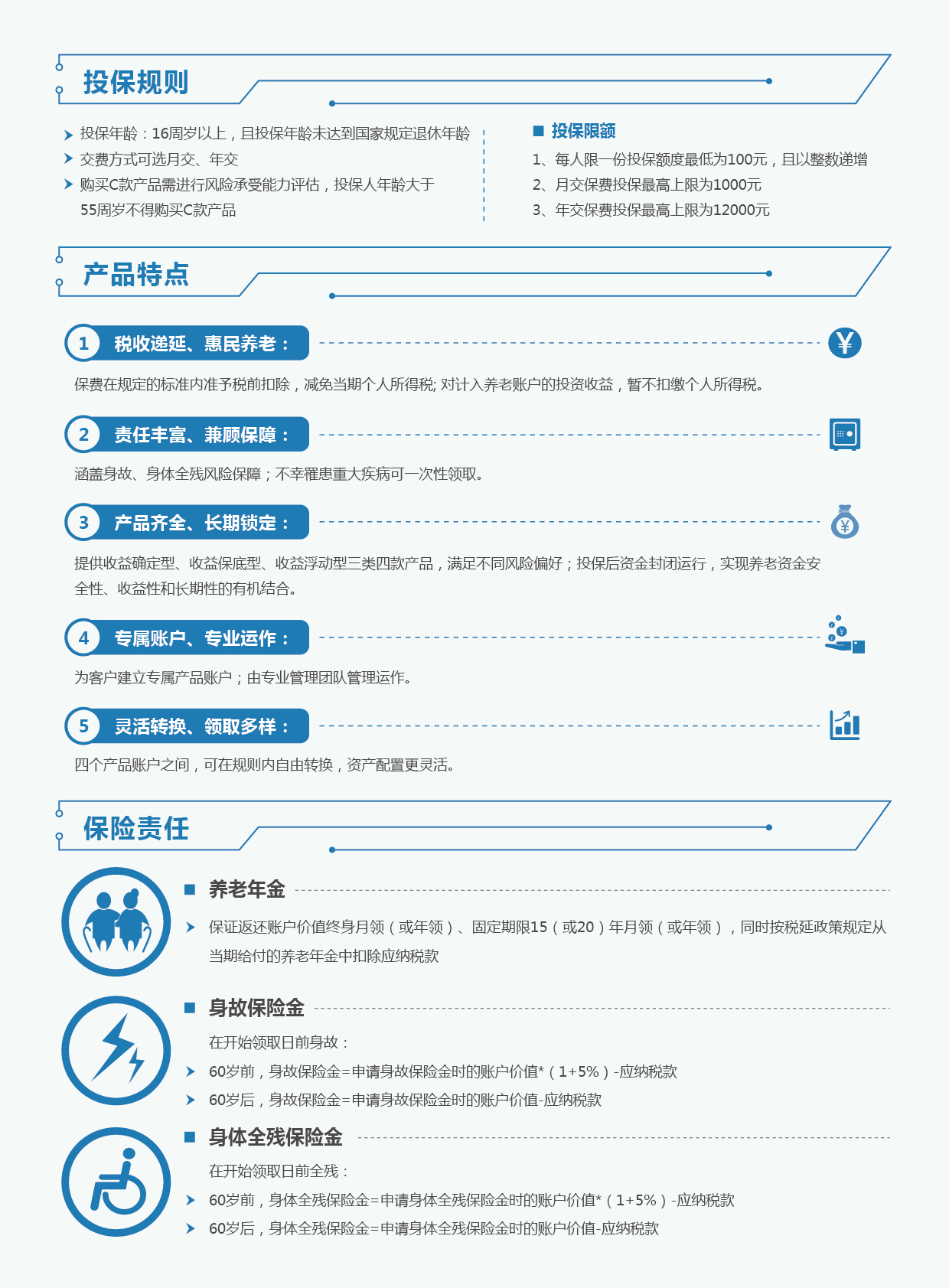 2、產(chǎn)品運營安全:本公司遵循“公平、合理、審慎”的原則,根據(jù)精算原理和有關(guān)保險監(jiān)管規(guī)定,對稅延養(yǎng)老保險產(chǎn)品計提各項準備金,并定期進行充足性測試。